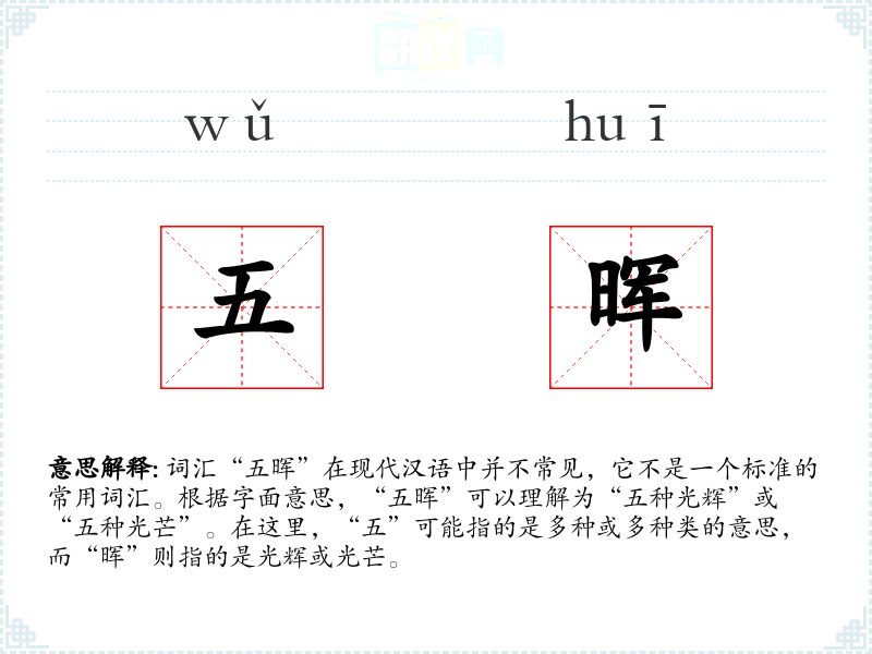 词汇“五晖”在现代汉语中并不常见,它不是一个标准的常用词汇。根据字面意思,“五晖”可以理解为“五种光辉”或“五种光芒”。在这里,“五”可能指的是多种或多种类的意思,而“晖”则指的是光辉或光芒。