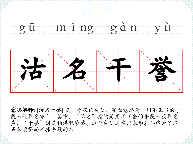[沽名干誉] 是一个汉语成语,字面意思是“用不正当的手段来谋取名誉”。其中,“沽名”指的是用不正当的手段来获取名声,“干誉”则是指谋取荣誉。这个成语通常用来形容那些为了名声和荣誉而不择手段的人。