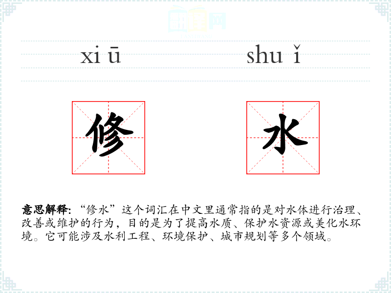 在英语中,类似的词汇可能是“water management”或“water conservation”,它们在概念上与“修水”相似,但具体侧重点和使用语境可能有所不同。