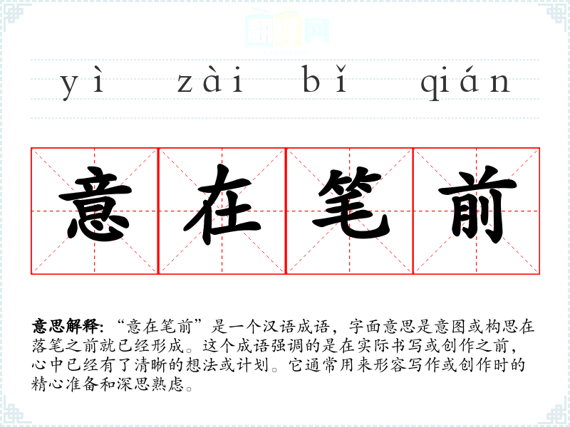 “意在笔前”这个成语源自**古代文人的创作理念,强调在写作之前要有充分的思考和准备。随着时间的推移,这个成语被广泛应用于各种需要前期规划和准备的场合。