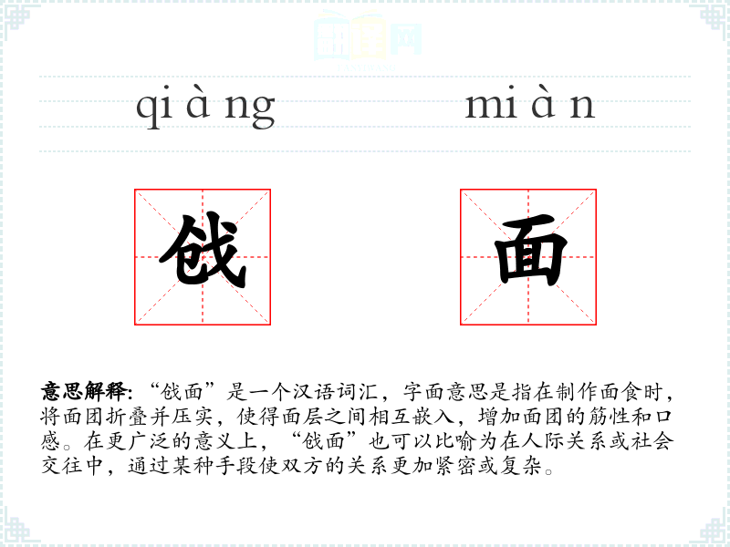“戗面”是一个汉语词汇,字面意思是指在制作面食时,将面团折叠并压实,使得面层之间相互嵌入,增加面团的筋性和口感。在更广泛的意义上,“戗面”也可以比喻为在人际关系或社会交往中,通过某种手段使双方的关系更加紧密或复杂。