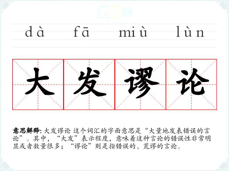 “大发谬论”这个词汇的构成较为直接,其中“大发”源自汉语中的常用表达,意指大量或强烈地做某事;“谬论”则是一个古老的词汇,源自于“谬”字,意为错误或荒谬。这个词汇在现代汉语中被广泛使用,用以批评错误的言论。