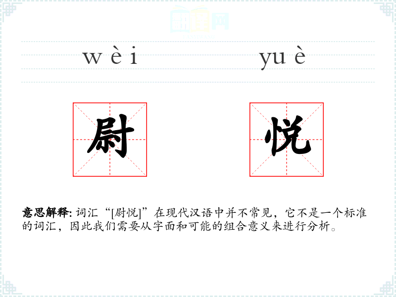 词汇“[尉悦]”在现代汉语中并不常见,它不是一个标准的词汇,因此我们需要从字面和可能的组合意义来进行分析。