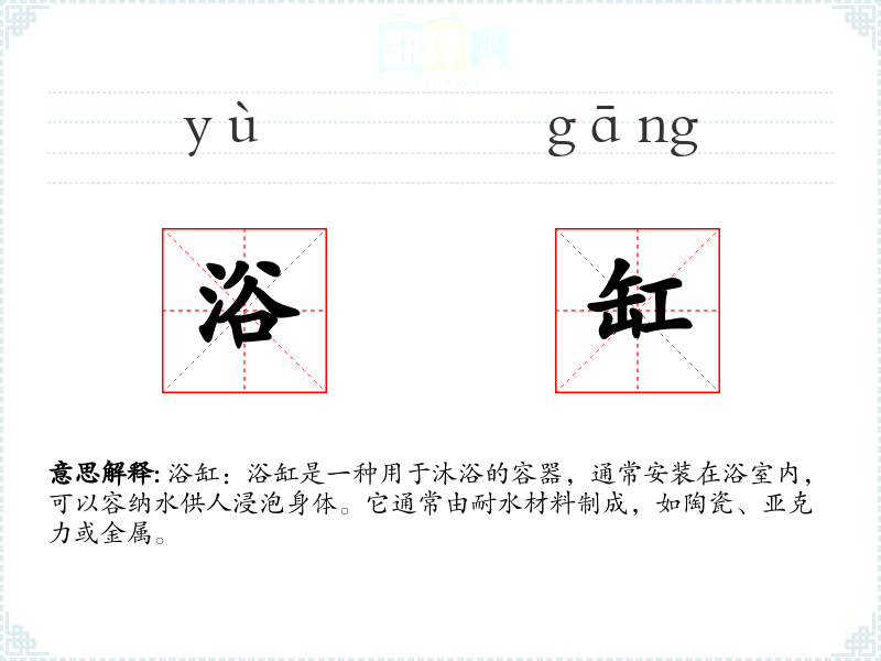 - 同义词:浴盆、浴池、浸浴器
