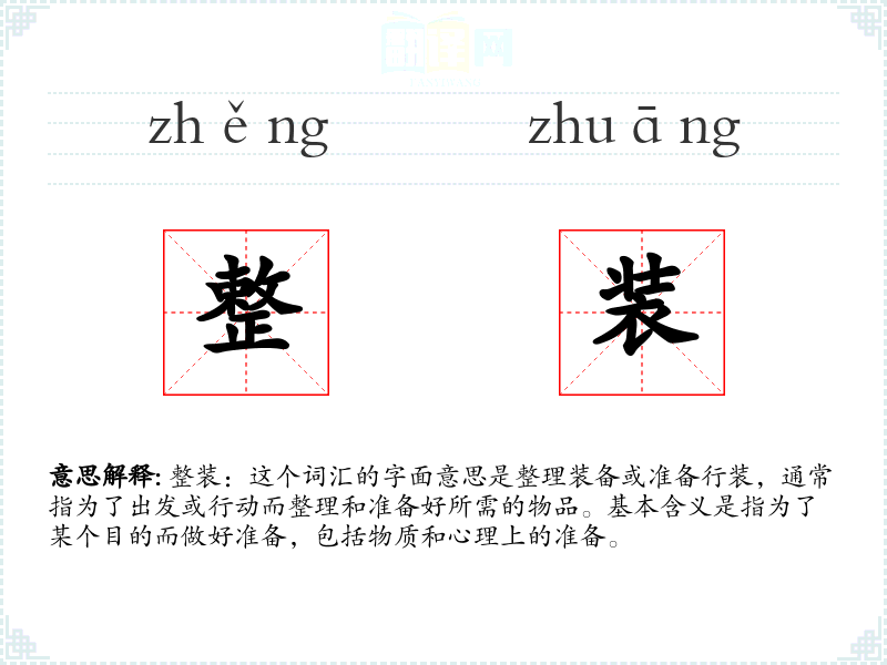 整装:这个词汇的字面意思是整理装备或准备行装,通常指为了出发或行动而整理和准备好所需的物品。基本含义是指为了某个目的而做好准备,包括物质和心理上的准备。