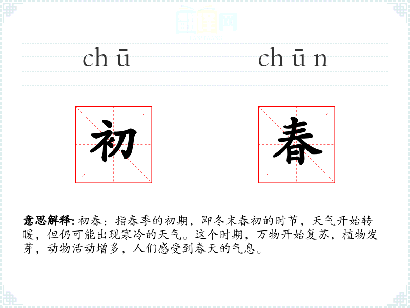 初春:指春季的初期,即冬末春初的时节,天气开始转暖,但仍可能出现寒冷的天气。这个时期,万物开始复苏,植物发芽,动物活动增多,人们感受到春天的气息。