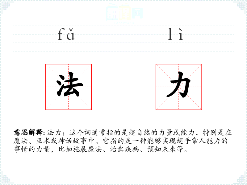 法力:这个词通常指的是超自然的力量或能力,特别是在魔法、巫术或神话故事中。它指的是一种能够实现超乎常人能力的事情的力量,比如施展魔法、治愈疾病、预知未来等。
