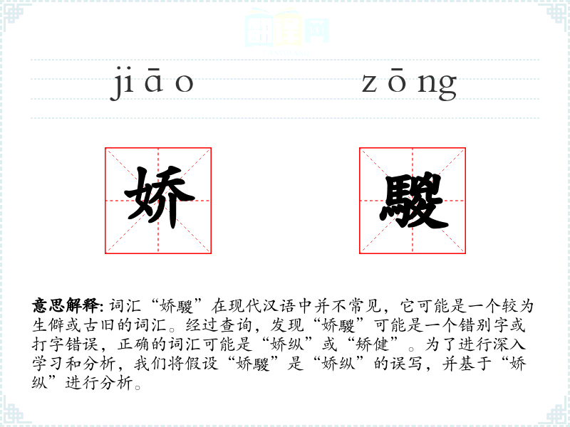 词汇“娇騣”在现代汉语中并不常见,它可能是一个较为生僻或古旧的词汇。经过查询,发现“娇騣”可能是一个错别字或打字错误,正确的词汇可能是“娇纵”或“矫健”。为了进行深入学*和分析,我们将假设“娇騣”是“娇纵”的误写,并基于“娇纵”进行分析。