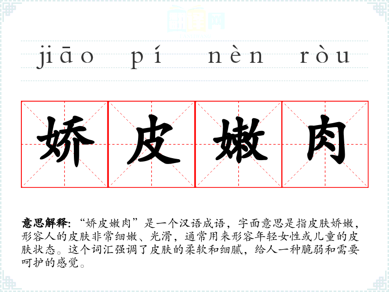 “娇皮嫩肉”这个词汇的词源较为直接,由“娇”、“皮”、“嫩”、“肉”四个字组成,每个字都有其明确的意义。在历史演变中,这个词汇一直用来形容人的皮肤状态,没有太大的变化。