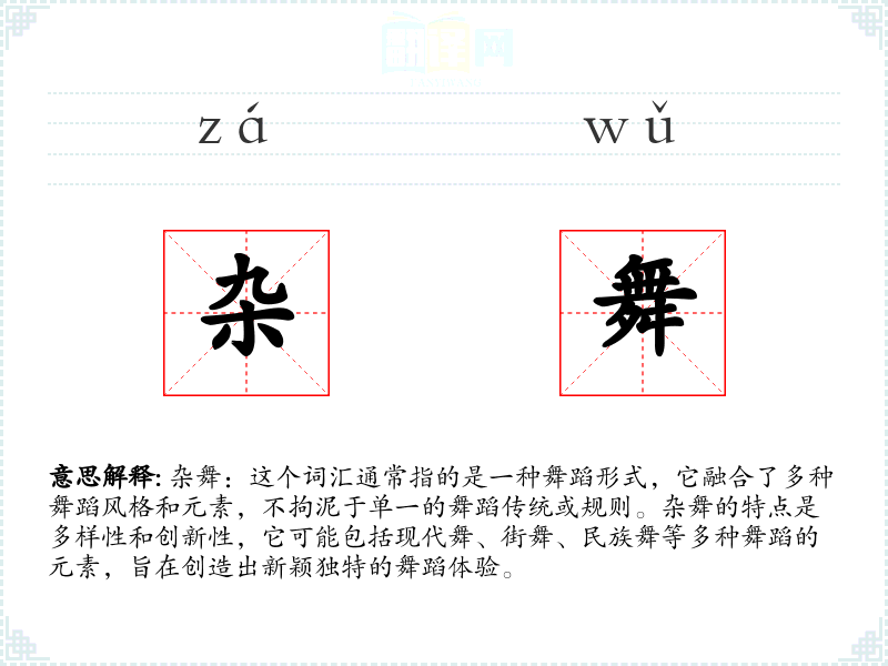 杂舞:这个词汇通常指的是一种舞蹈形式,它融合了多种舞蹈风格和元素,不拘泥于单一的舞蹈传统或规则。杂舞的特点是多样性和创新性,它可能包括现代舞、街舞、民族舞等多种舞蹈的元素,旨在创造出新颖独特的舞蹈体验。