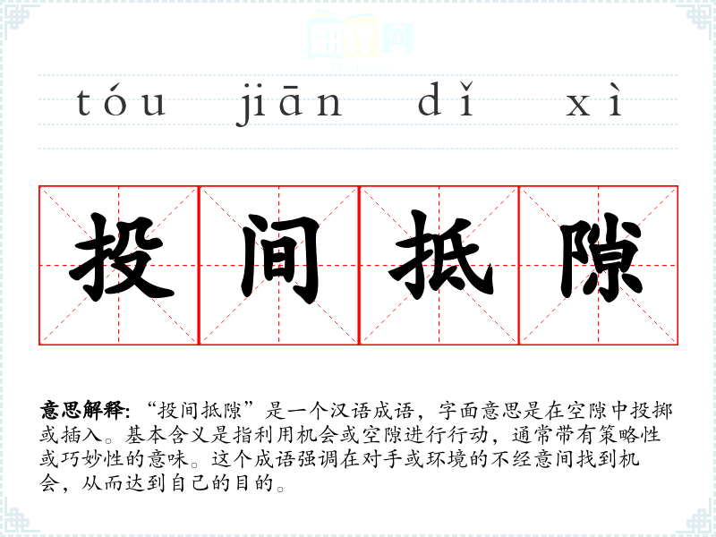 在文学作品中,“投间抵隙”常用来形容人物的智谋或策略,如在战争、政治斗争或日常生活中巧妙地利用机会。在口语中,这个成语可能用来形容某人善于抓住机会或利用别人的疏忽。在专业领域,如商业策略或军事战术中,这个成语可以用来描述一种精明的决策或行动方式。
