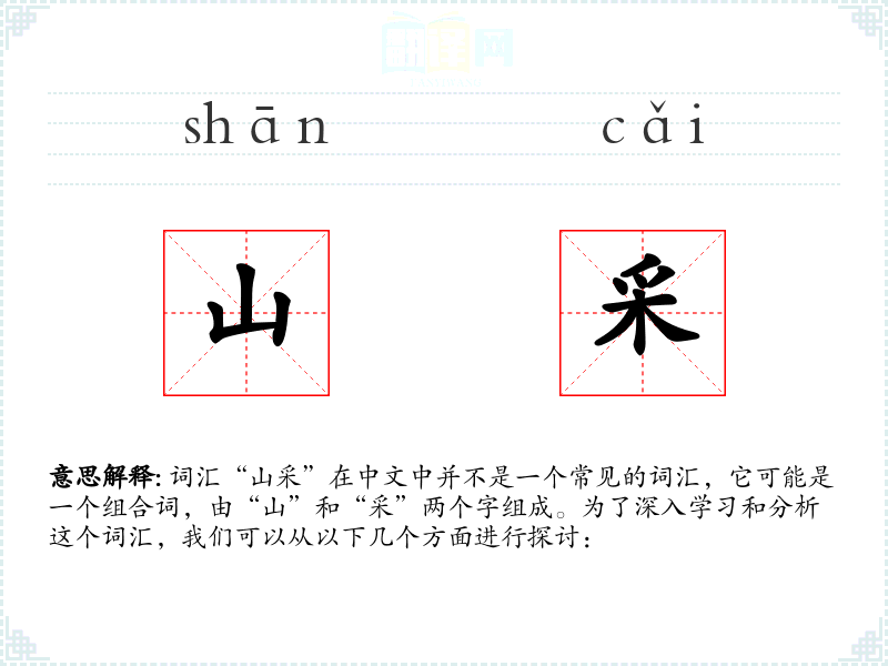 词汇“山采”在中文中并不是一个常见的词汇,它可能是一个组合词,由“山”和“采”两个字组成。为了深入学*和分析这个词汇,我们可以从以下几个方面进行探讨: