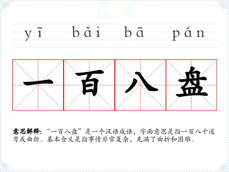 “一百八盘”是一个汉语成语,字面意思是指一百八十道弯或曲折。基本含义是指事情非常复杂,充满了曲折和困难。