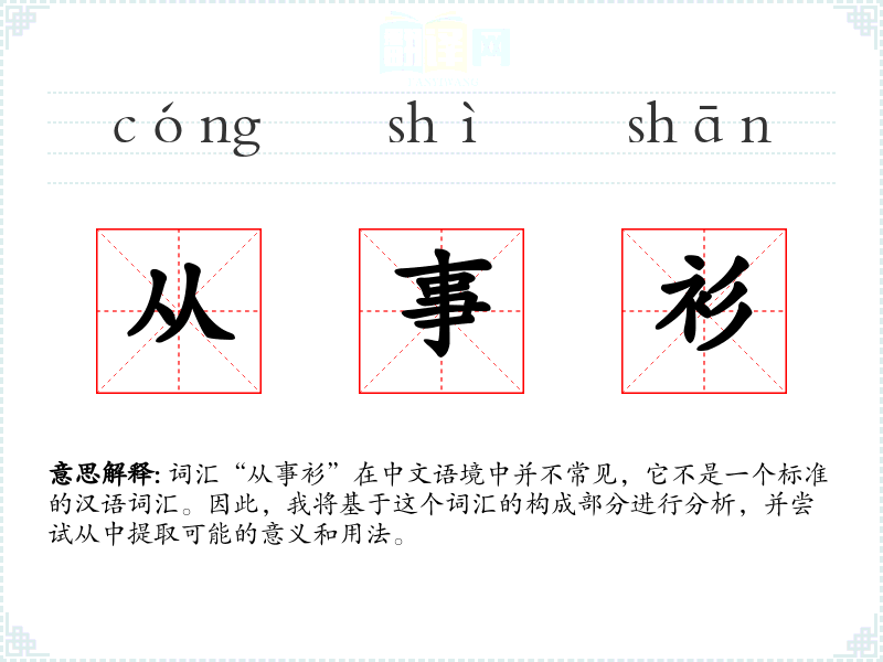 词汇“从事衫”在中文语境中并不常见,它不是一个标准的汉语词汇。因此,我将基于这个词汇的构成部分进行分析,并尝试从中提取可能的意义和用法。