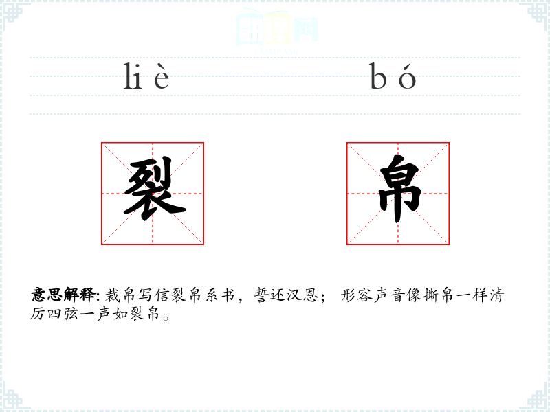 裁帛写信裂帛系书,誓还汉恩; 形容声音像撕帛一样清厉四弦一声如裂帛。