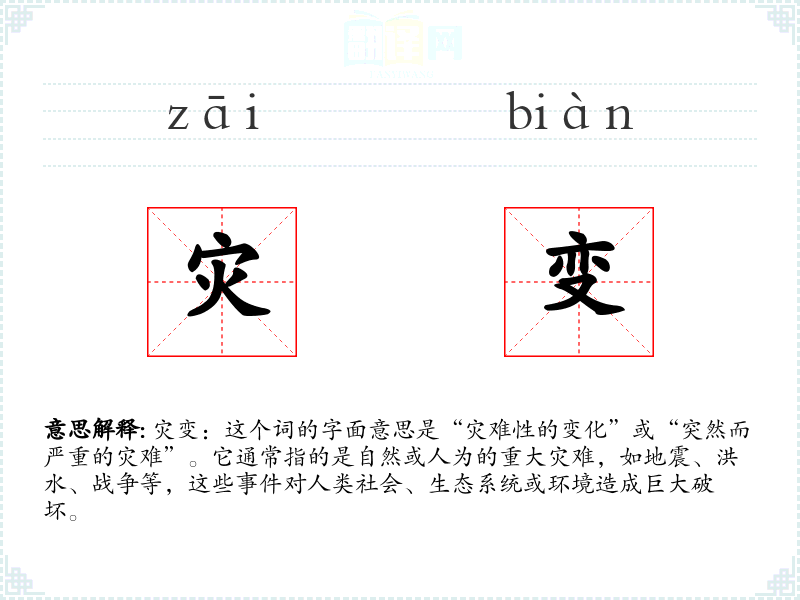“灾变”一词源自汉语,由“灾”和“变”两个字组成。在古代汉语中,“灾”指天灾人祸,“变”指变化。随着时间的推移,这个词逐渐被用来描述任何形式的灾难性**。