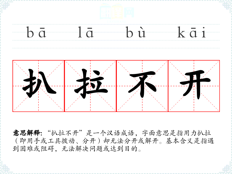“扒拉不开”是一个汉语成语,字面意思是指用力扒拉(即用手或工具拨动、分开)却无法分开或解开。基本含义是指遇到困难或阻碍,无法解决问题或达到目的。