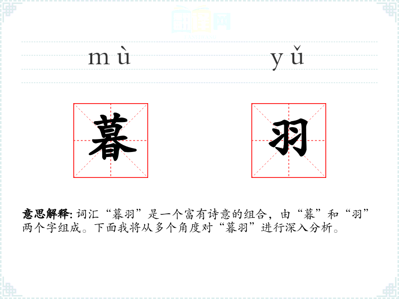 - 词源:“暮”和“羽”都是汉语中的基本词汇,没有特别复杂的词源故事。