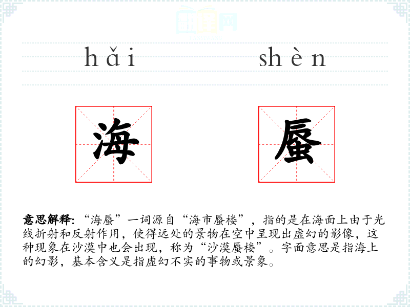 “海蜃”一词源自“海市蜃楼”,指的是在海面上由于光线折射和反射作用,使得远处的景物在空中呈现出虚幻的影像,这种现象在沙漠中也会出现,称为“沙漠蜃楼”。字面意思是指海上的幻影,基本含义是指虚幻不实的事物或景象。