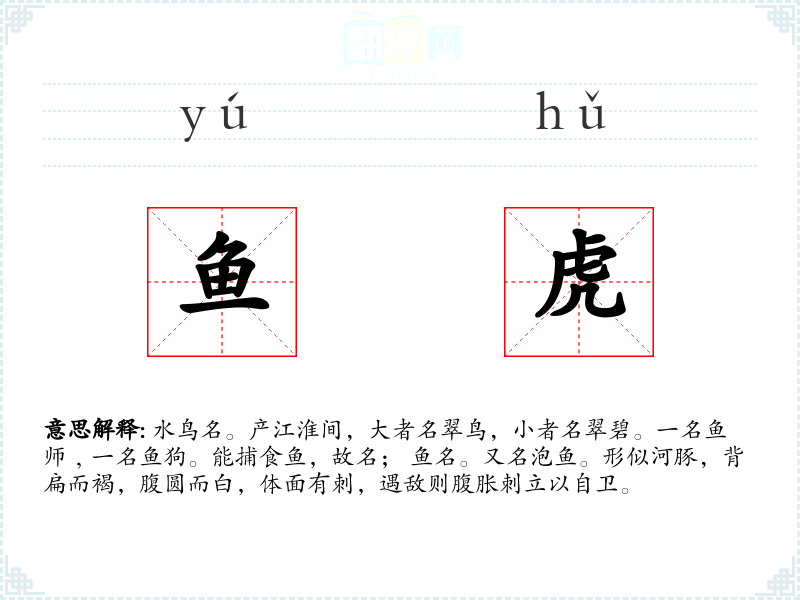水鸟名。产江淮间,大者名翠鸟,小者名翠碧。一名鱼师﹐一名鱼狗。能捕食鱼,故名; 鱼名。又名泡鱼。形似河豚,背扁而褐,腹圆而白,体面有刺,遇敌则腹胀刺立以自卫。