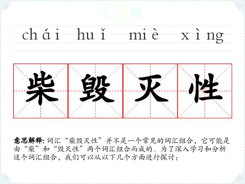 词汇“柴毁灭性”并不是一个常见的词汇组合,它可能是由“柴”和“毁灭性”两个词汇组合而成的。为了深入学习和分析这个词汇组合,我们可以从以下几个方面进行探讨: