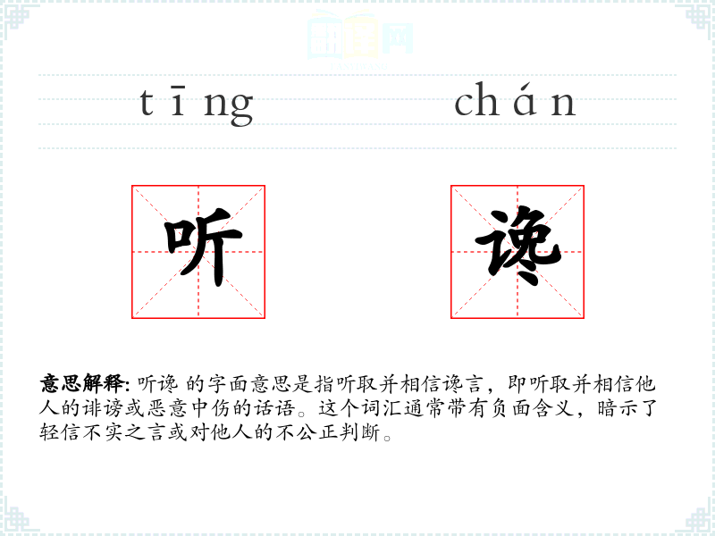 听谗 的字面意思是指听取并相信谗言,即听取并相信他人的诽谤或恶意中伤的话语。这个词汇通常带有负面含义,暗示了轻信不实之言或对他人的不公正判断。