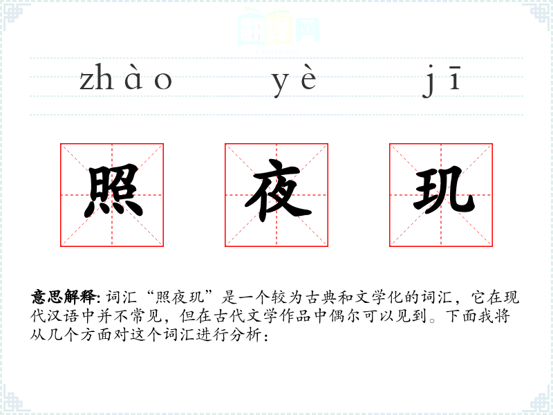 词汇“照夜玑”是一个较为古典和文学化的词汇,它在现代汉语中并不常见,但在古代文学作品中偶尔可以见到。下面我将从几个方面对这个词汇进行分析: