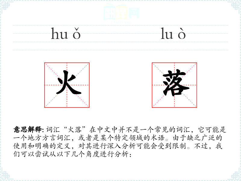 词汇“火落”在中文中并不是一个常见的词汇,它可能是一个地方方言词汇,或者是某个特定领域的术语。由于缺乏广泛的使用和明确的定义,对其进行深入分析可能会受到限制。不过,我们可以尝试从以下几个角度进行分析: