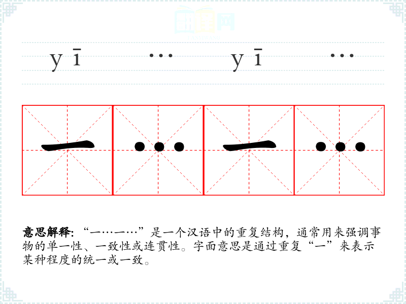 “一…一…”是一个汉语中的重复结构,通常用来强调事物的单一性、一致性或连贯性。字面意思是通过重复“一”来表示某种程度的统一或一致。