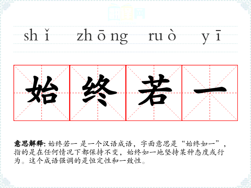 始终若一 是一个汉语成语,字面意思是“始终如一”,指的是在任何情况下都保持不变,始终如一地坚持某种态度或行为。这个成语强调的是恒定性和一致性。