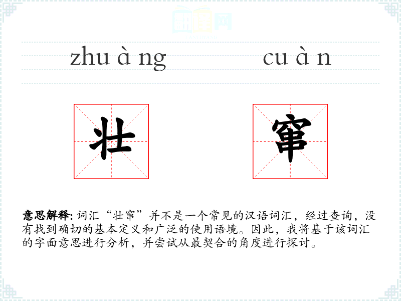 词汇“壮窜”并不是一个常见的汉语词汇,经过查询,没有找到确切的基本定义和广泛的使用语境。因此,我将基于该词汇的字面意思进行分析,并尝试从最契合的角度进行探讨。