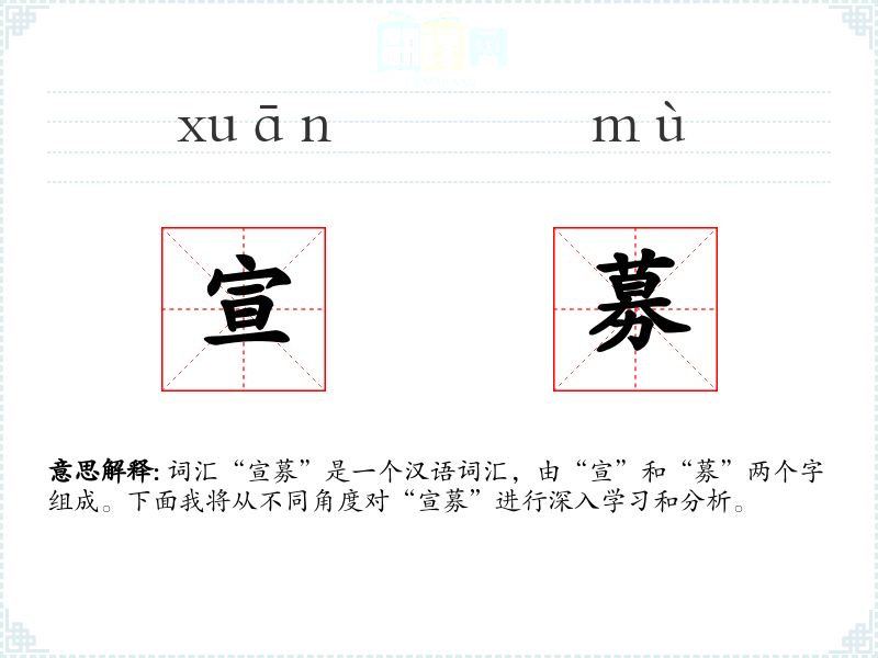 “宣募”字面意思是通过宣传来募集资金、人员或其他资源。其中,“宣”指的是宣传、宣告,而“募”指的是募集、招募。