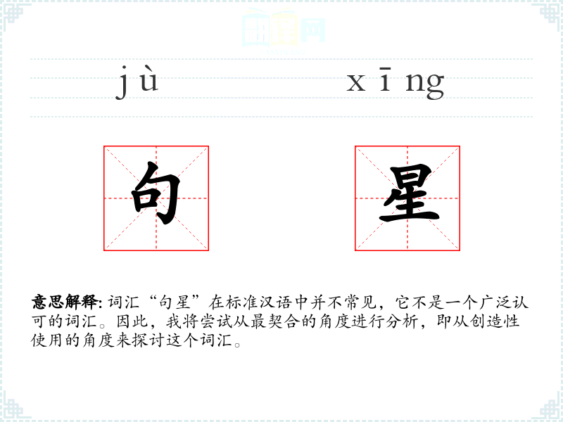 词汇“句星”在标准汉语中并不常见,它不是一个广泛认可的词汇。因此,我将尝试从最契合的角度进行分析,即从创造性使用的角度来探讨这个词汇。