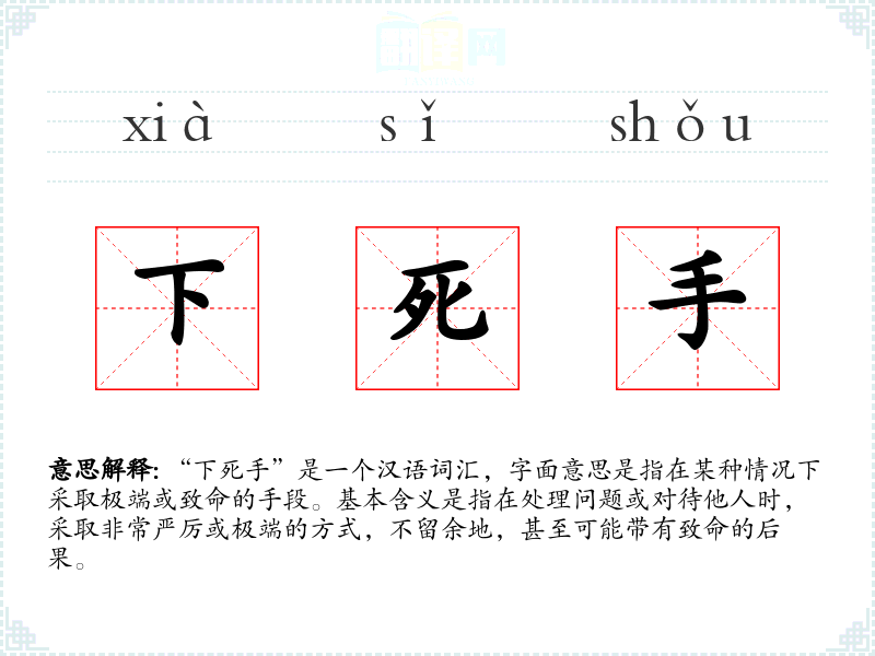 “下死手”是一个汉语词汇,字面意思是指在某种情况下采取极端或致命的手段。基本含义是指在处理问题或对待他人时,采取非常严厉或极端的方式,不留余地,甚至可能带有致命的后果。