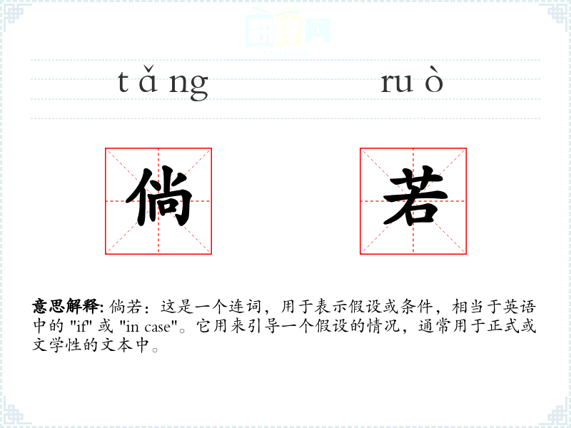 倘若:这是一个连词,用于表示假设或条件,相当于英语中的 "if" 或 "in case"。它用来引导一个假设的情况,通常用于正式或文学性的文本中。