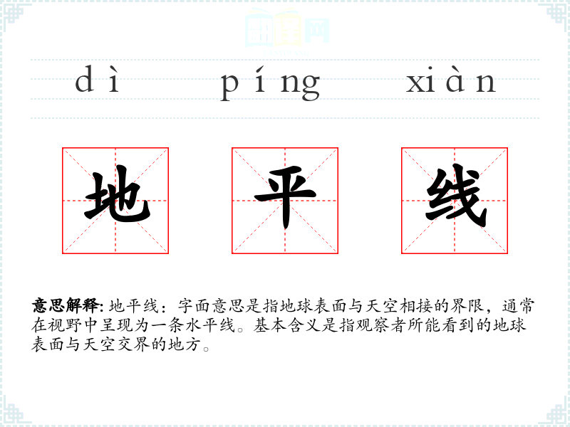 地平线:字面意思是指地球表面与天空相接的界限,通常在视野中呈现为一条水平线。基本含义是指观察者所能看到的地球表面与天空交界的地方。