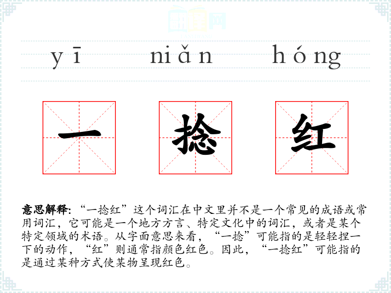由于“一捻红”不是一个标准词汇,它在不同语言或文化中的对应词汇可能不存在。如果有类似的表达,那可能是在描述某种特定的动作或结果。