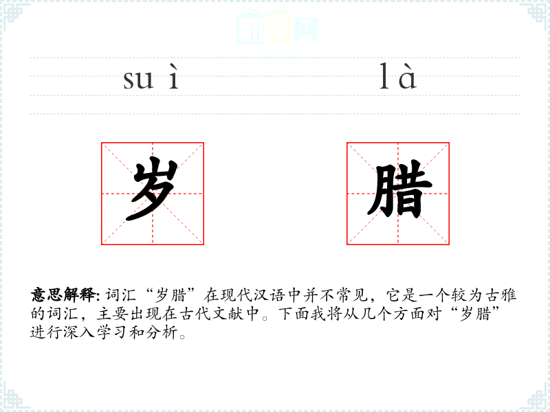 词汇“岁腊”在现代汉语中并不常见,它是一个较为古雅的词汇,主要出现在古代文献中。下面我将从几个方面对“岁腊”进行深入学*和分析。