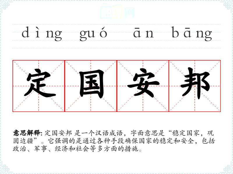 定国安邦 是一个汉语成语,字面意思是“稳定国家,巩固边疆”。它强调的是通过各种手段确保国家的稳定和安全,包括政治、军事、经济和社会等多方面的措施。