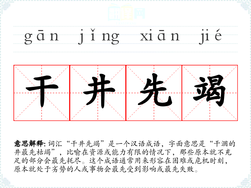 词汇“干井先竭”是一个汉语成语,字面意思是“干涸的井最先枯竭”,比喻在资源或能力有限的情况下,那些原本就不充足的部分会最先耗尽。这个成语通常用来形容在困难或危机时刻,原本就处于劣势的人或事物会最先受到影响或最先失败。