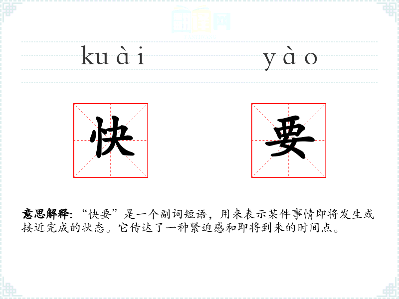 “快要”是一个副词短语,用来表示某件事情即将发生或接近完成的状态。它传达了一种紧迫感和即将到来的时间点。