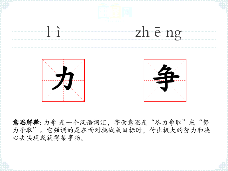 “力争”一词源于汉语,由“力”和“争”两个字组成。在古代汉语中,“力”指力量或努力,“争”指竞争或争取。随着时间的推移,“力争”逐渐演变成现代汉语中的常用词汇,用于表达尽最大努力去争取某事物的意思。
