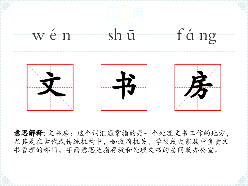 文书房:这个词汇通常指的是一个处理文书工作的地方,尤其是在古代或传统机构中,如政府机关、学校或大家族中负责文书管理的部门。字面意思是指存放和处理文书的房间或办公室。