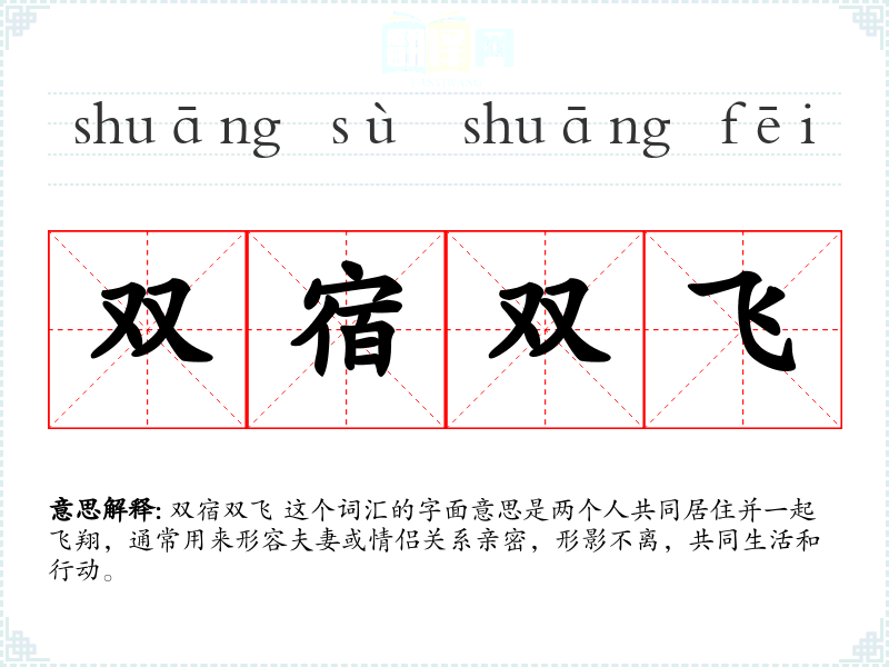 双宿双飞 这个词汇的字面意思是两个人共同居住并一起飞翔,通常用来形容夫妻或情侣关系亲密,形影不离,共同生活和行动。