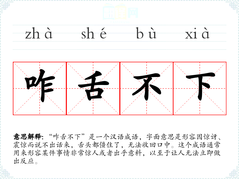 “咋舌不下”这个成语的词源较为模糊,但它反映了汉语中对生理反应的描述如何转化为心理状态的表达。随着时间的推移,这个成语的使用逐渐固定,成为描述极度惊讶的常用语。
