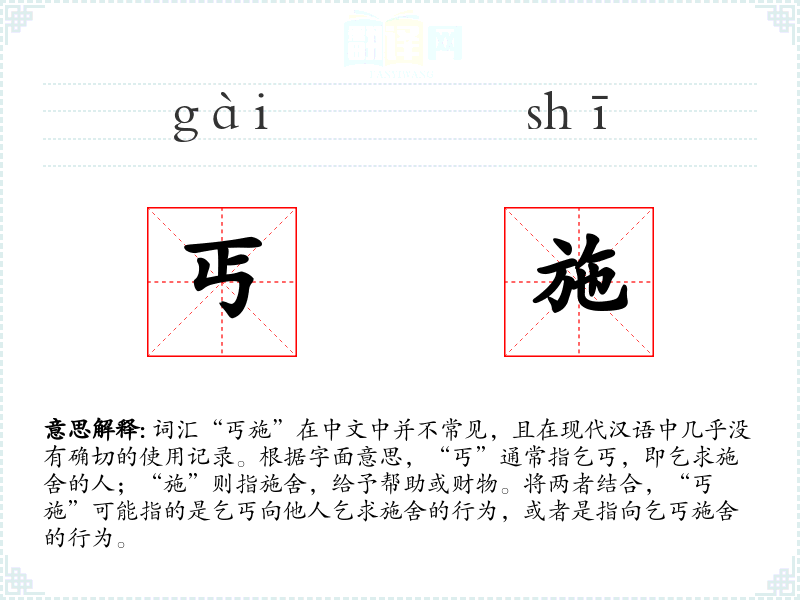 词汇“丐施”在中文中并不常见,且在现代汉语中几乎没有确切的使用记录。根据字面意思,“丐”通常指乞丐,即乞求施舍的人;“施”则指施舍,给予帮助或财物。将两者结合,“丐施”可能指的是乞丐向他人乞求施舍的行为,或者是指向乞丐施舍的行为。