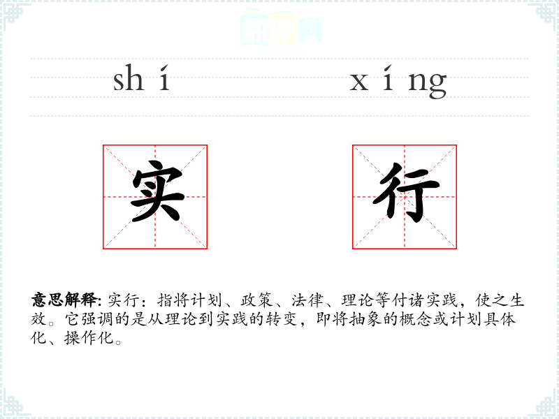 实行:指将计划、政策、法律、理论等付诸实践,使之生效。它强调的是从理论到实践的转变,即将抽象的概念或计划具体化、操作化。