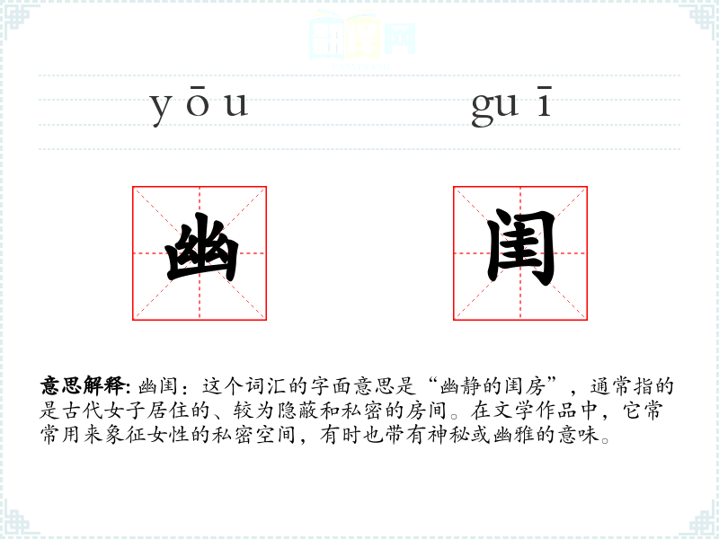 幽闺:这个词汇的字面意思是“幽静的闺房”,通常指的是古代女子居住的、较为隐蔽和私密的房间。在文学作品中,它常常用来象征女性的私密空间,有时也带有神秘或幽雅的意味。