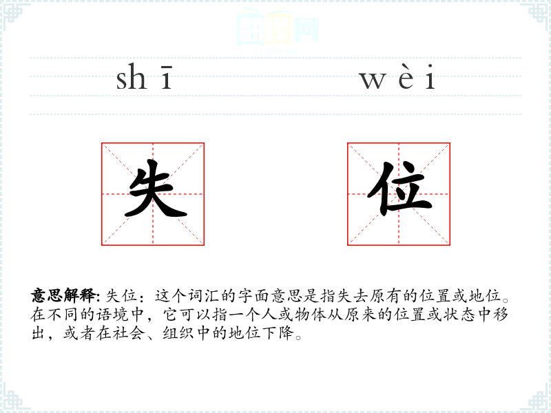 "失位"的意思解释、失位是什么意思由翻译网汉语词典查词提供。