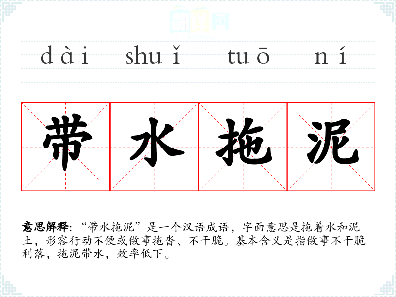 “带水拖泥”是一个汉语成语,字面意思是拖着水和泥土,形容行动不便或做事拖沓、不干脆。基本含义是指做事不干脆利落,拖泥带水,效率低下。